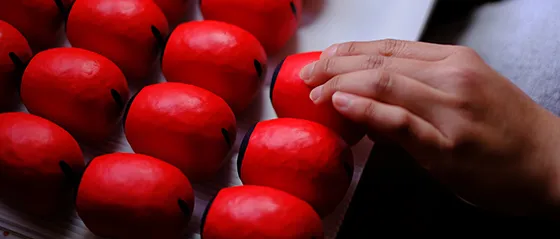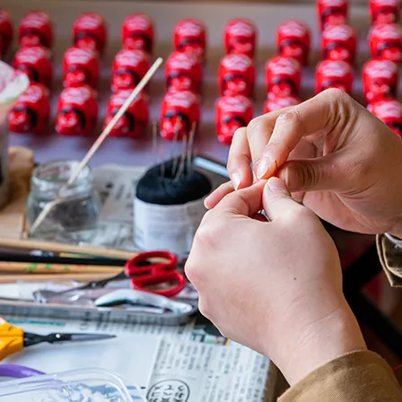 会津の赤べこや起き上がり小法師の歴史は、 時の藩主である蒲生氏郷(がもううじさと)が殖産振興のため職人を招いたことに由来し、 中国から伝来したといわれる張り子の技術は現在も日本各地に様々な形で残っています。 そんな張り子の主な原料は紙です。水分を含ませた紙を何層も型に張り重ることで立体となり、 胡粉とにかわでコーティングした後、鮮やかな色彩が施されます。 張り子は先人たちの知恵がふんだんに盛り込まれていてどの工程も一つ一つ丁寧に作られます。